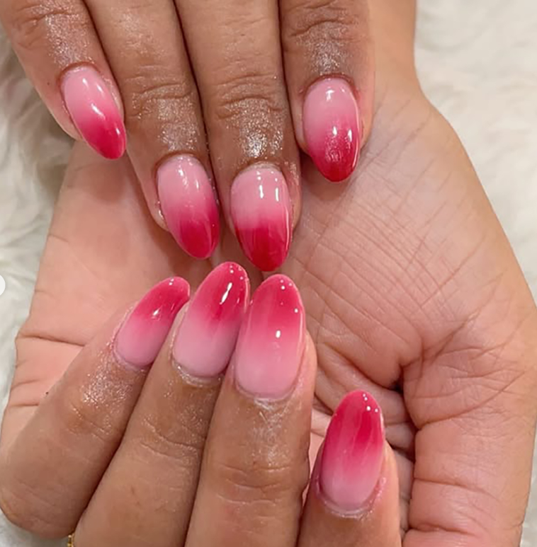 These stunning red ombre nails blend deep crimson into soft pink for a fiery yet elegant look.