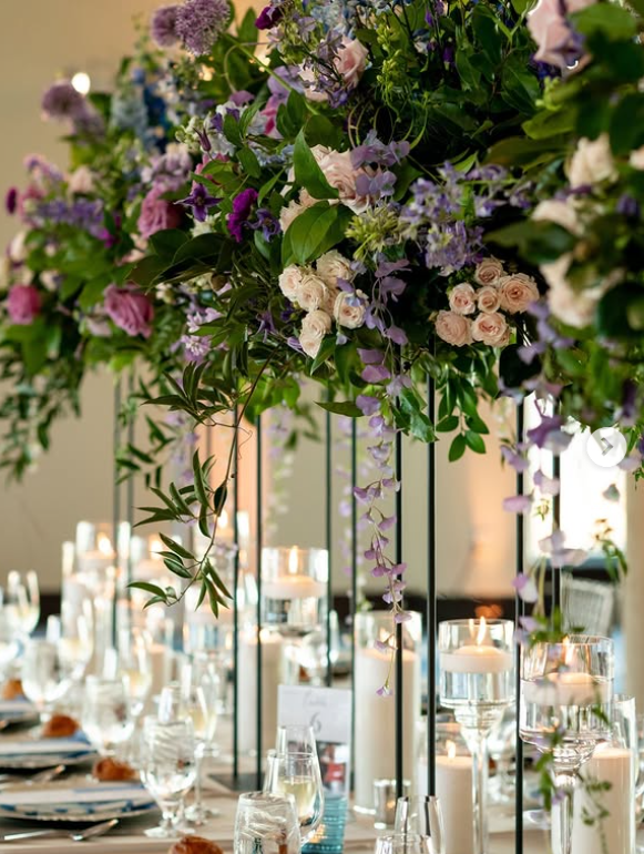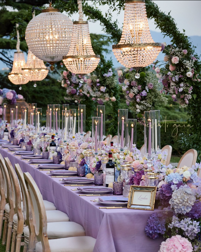 With cascading florals in lavender and lilac, tall candlelit centerpieces, and sparkling chandeliers overhead, it creates a dreamy and romantic atmosphere.