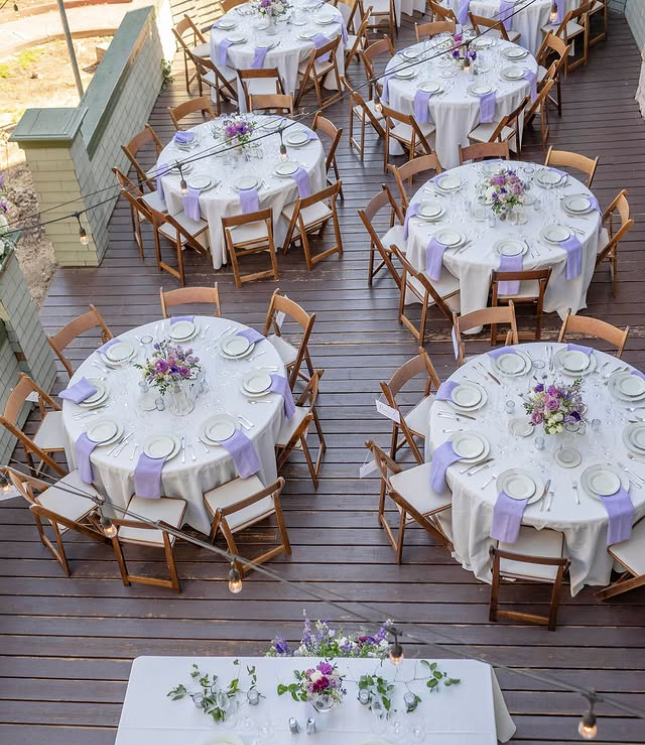 This chic outdoor wedding reception features round tables dressed in crisp white linens with soft purple napkins and lush lavender-inspired floral centerpieces.