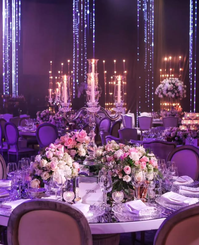 A luxurious wedding reception bathed in dreamy purple lighting, complete with crystal candelabras, lush rose centerpieces, and elegant mirrored tablescapes.