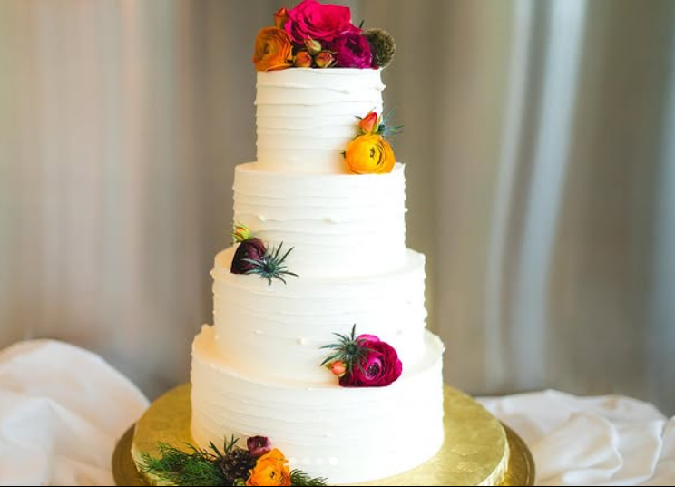 This elegant four-tiered wedding cake brings rustic charm to life with its simple white frosting and vibrant floral accents.