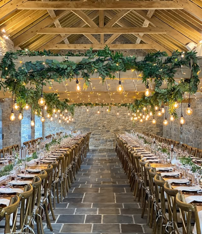 This rustic barn reception captures the essence of winter charm with its cozy wooden beams, warm lighting, and statement greenery centerpieces.