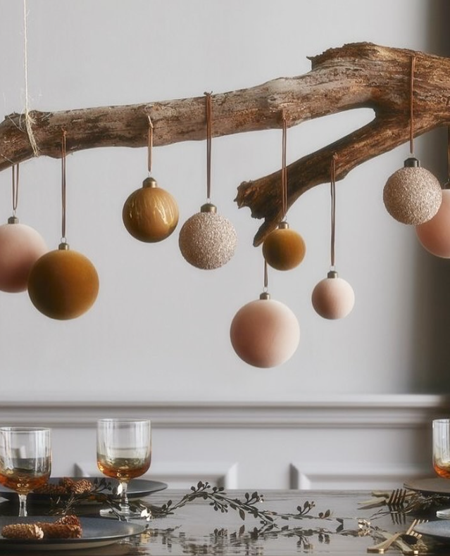 The wooden branch adorned with hanging neutral-toned ornaments creates a unique and earthy focal point above the table.