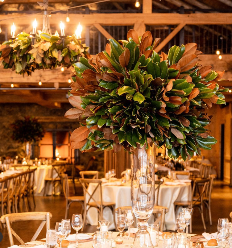 The natural textures and earthy tones create a welcoming atmosphere, while the towering arrangements of magnolia leaves add a bold yet elegant touch.