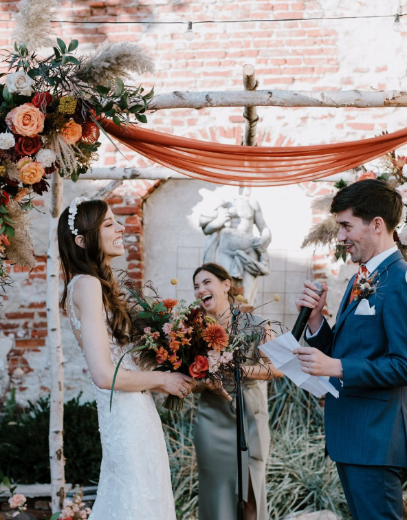 The couple exchanges vows under a simple wooden arch draped with terracotta fabric and adorned with earthy florals, pampas grass, and greenery.