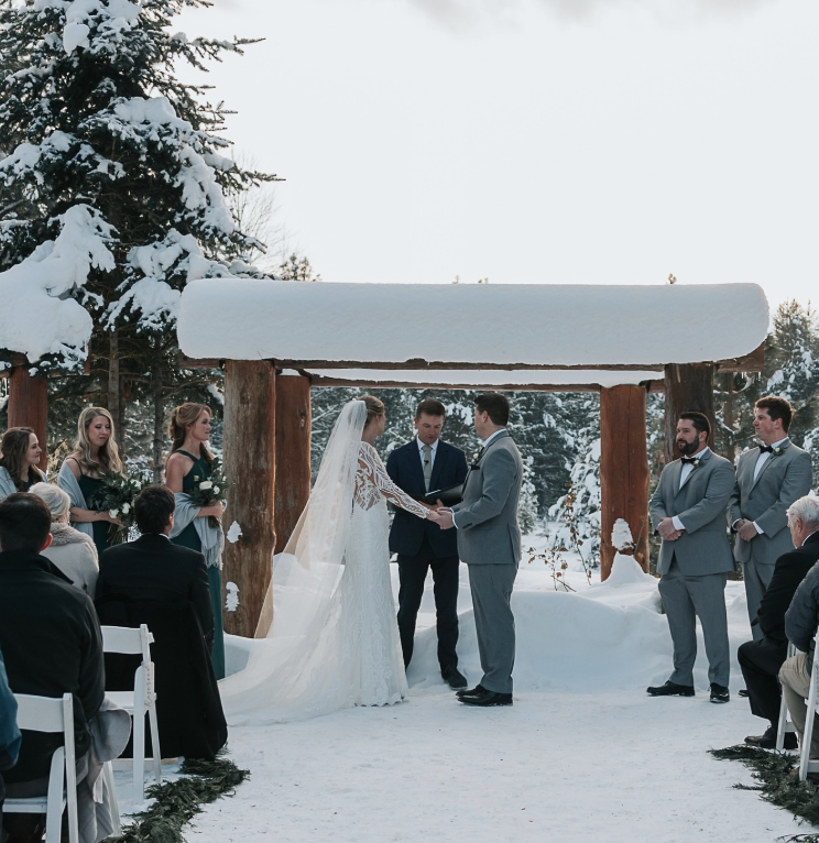 This winter wedding captures the essence of rustic romance with a snow-covered wooden arch framing the couple’s vows.