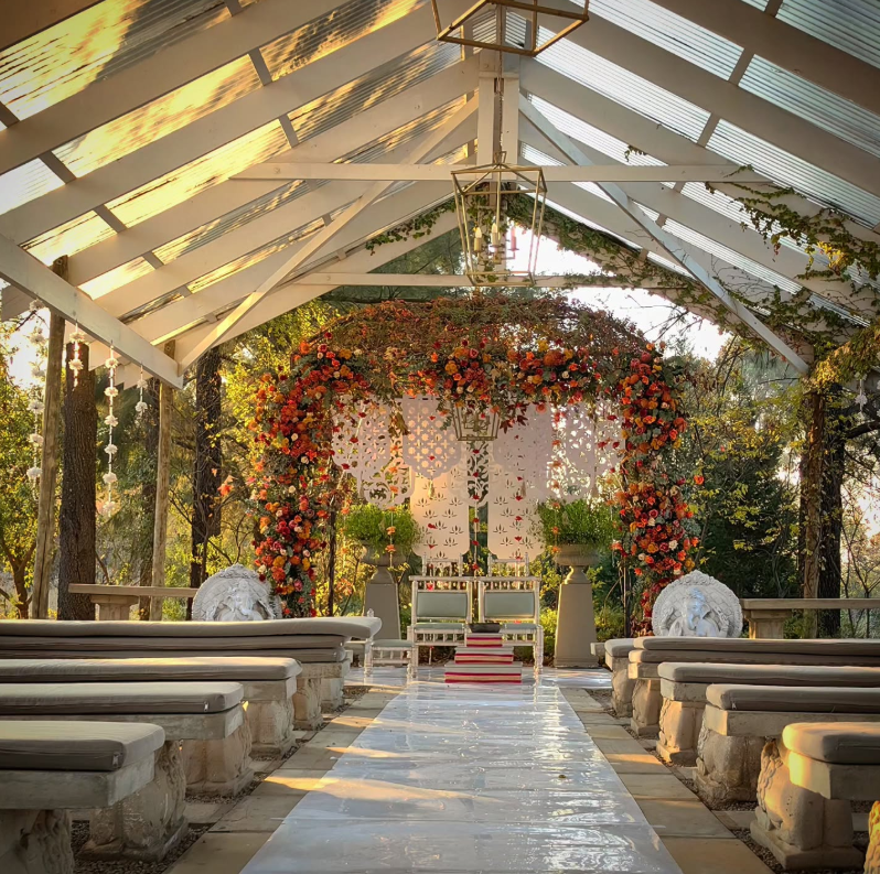The wooden beams draped in vines and the stunning floral arch filled with vibrant seasonal blooms create a warm and inviting backdrop.