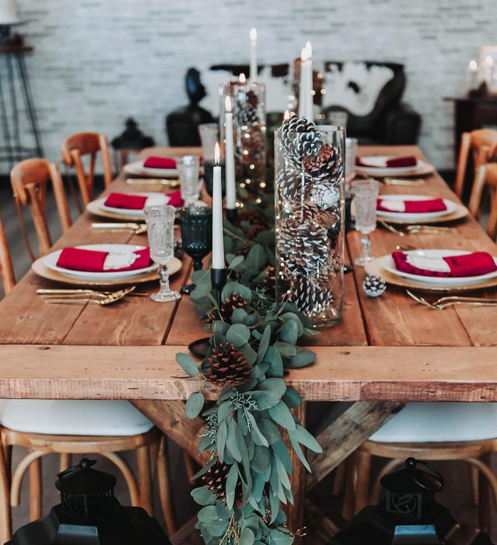 Red napkins bring a festive pop of color, perfectly complementing the neutral tones of the rustic wood and greenery.