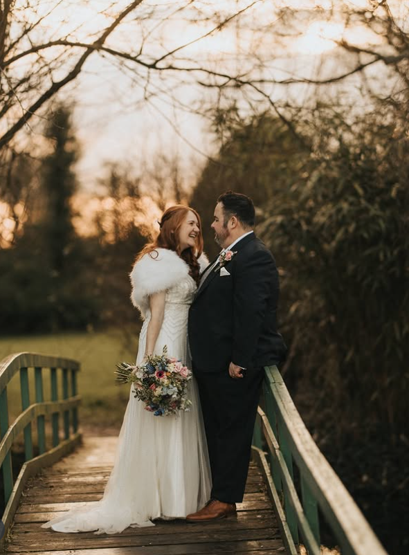 This heartwarming photo captures a bride and groom sharing a tender moment on a rustic wooden bridge, wrapped in the golden glow of a winter sunset.