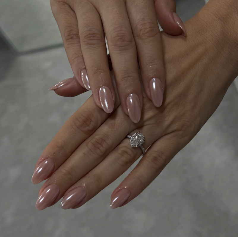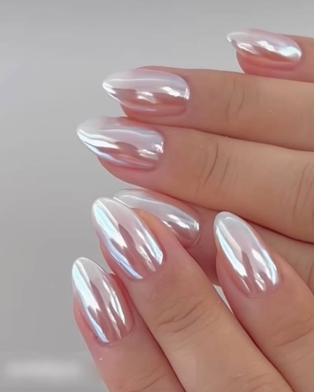 These dreamy pearl chrome nails glow with a soft, mirror-like shine, perfect for brides seeking an elegant yet modern manicure.