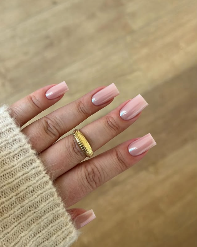 A chic nude base with a soft blush chrome overlay, creating a polished and modern bridal manicure.