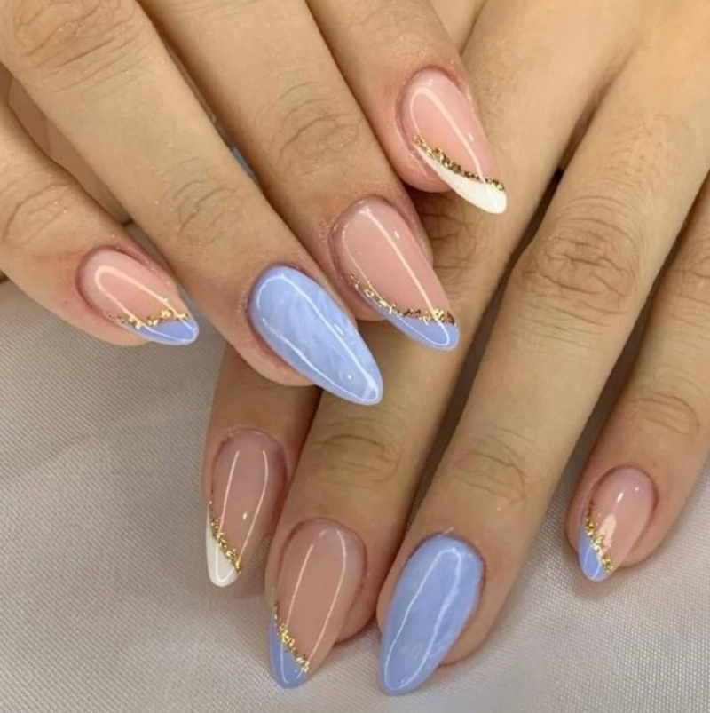 A chic dip powder design blending nude and soft blue tones, elevated with delicate gold accents.