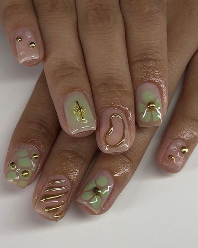 A creative dip powder manicure featuring soft green accents, gold charms, and abstract details.