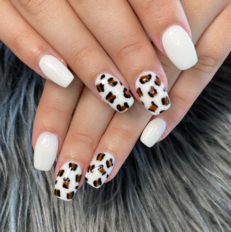 A bold dip powder manicure combining classic white nails with playful leopard print accents.