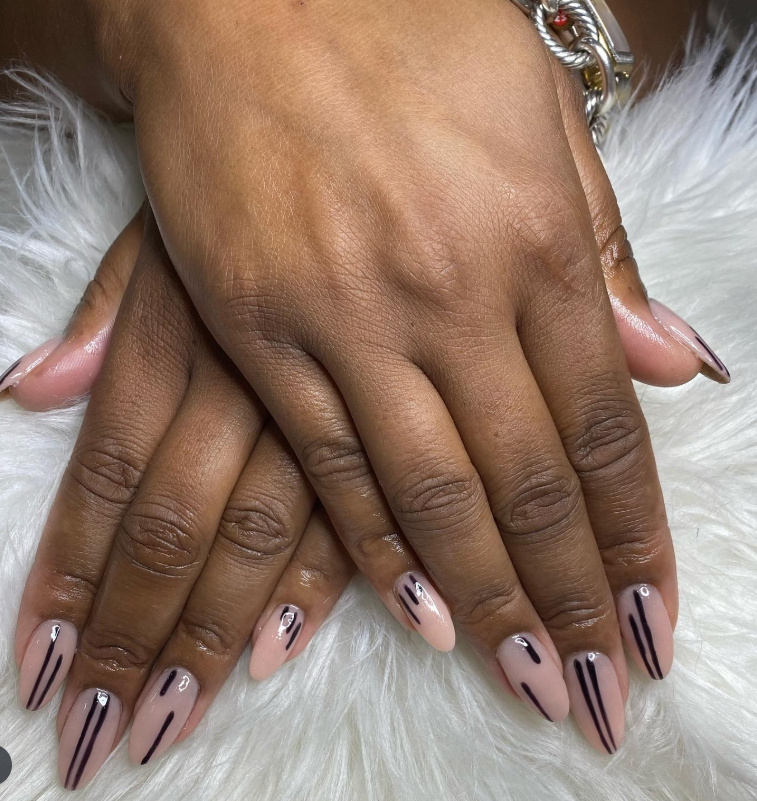 Nude dip powder nails detailed with sleek black stripes for a modern, minimalist look.