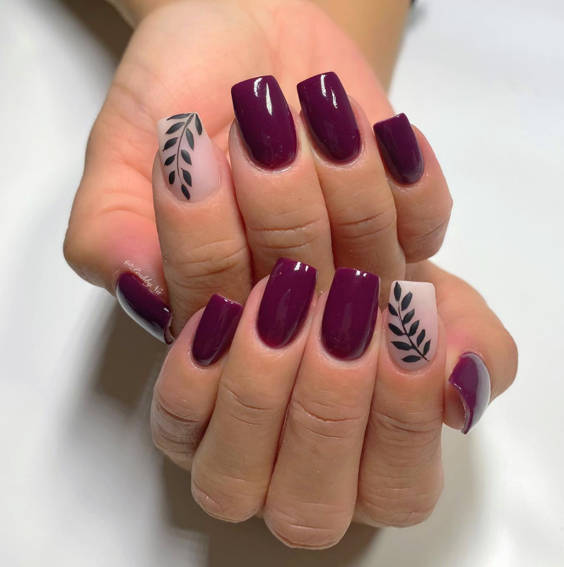 Bold plum dip powder nails paired with minimalist leaf art, perfect for fall or winter weddings.