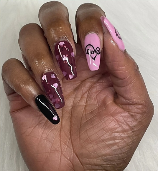 A romantic dip manicure in shades of pink, burgundy, and black, decorated with hearts and a “love” accent.