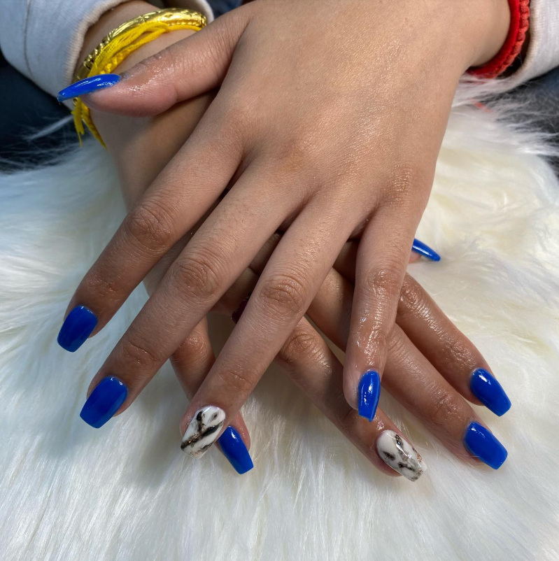 Vibrant royal blue dip nails paired with chic marble accent fingers, perfect for brides seeking a modern and daring look.