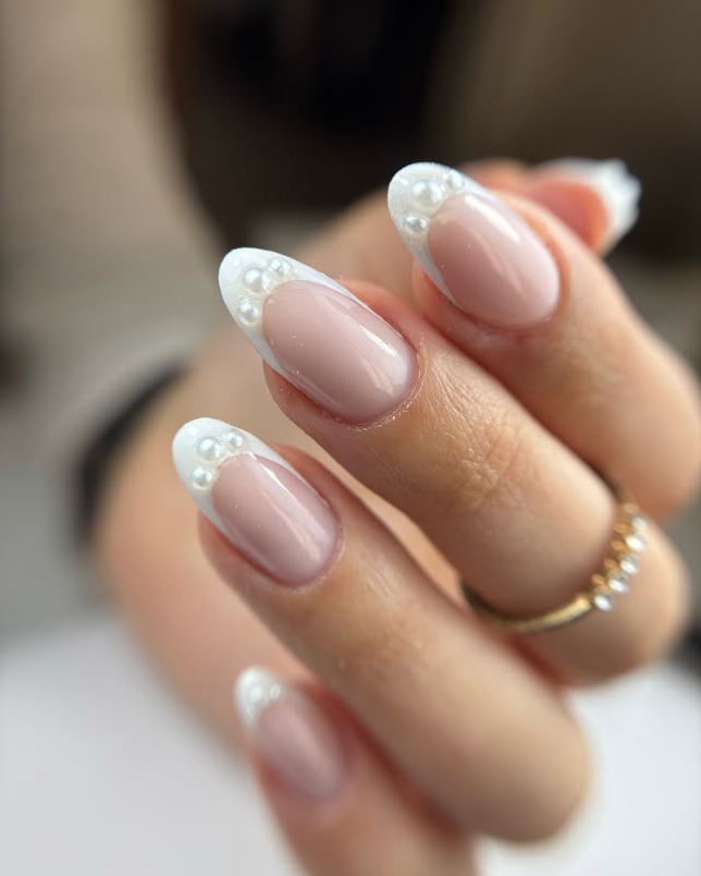 A soft ombré French tip paired with delicate pearl accents creates a timeless bridal manicure.