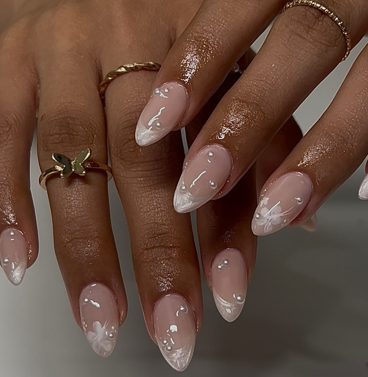 These romantic French nails feature a subtle white tip enhanced with tiny pearl-like dots and hand-painted floral details.