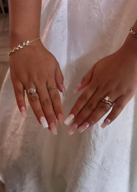 These long, coffin-shaped nails feature a soft nude base with delicate white marble accents, creating a sophisticated and modern bridal look.