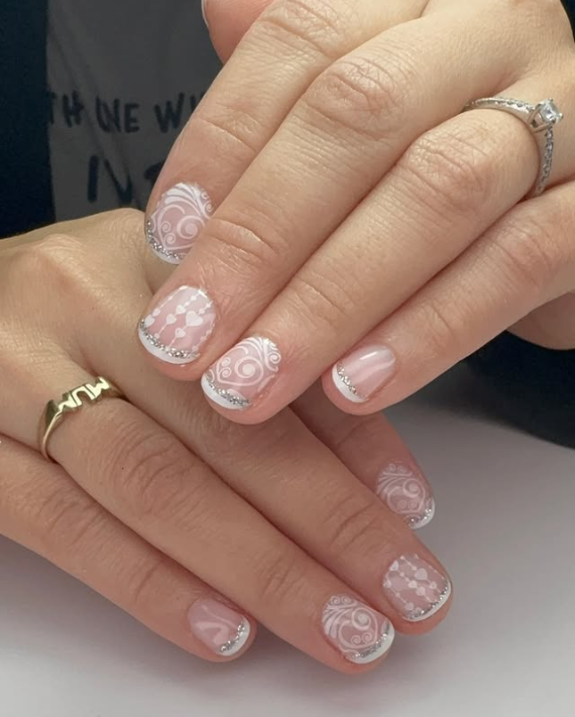 These short, natural nails are elevated with delicate lace-like patterns, subtle silver glitter tips, and soft pink tones.