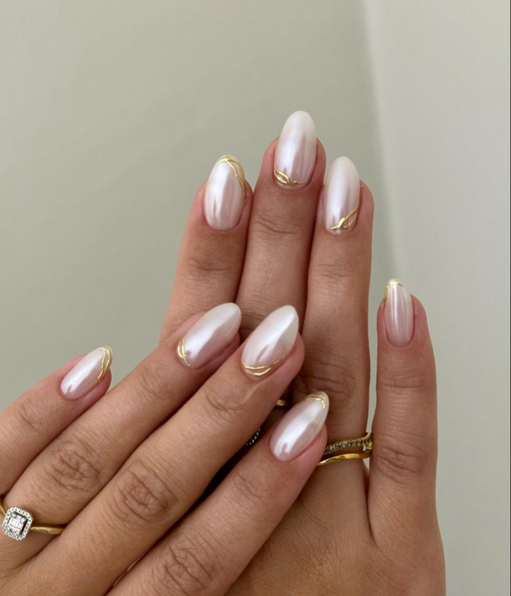 Soft pearl chrome nails detailed with delicate golden swirls bring a luxurious touch to your bridal manicure.