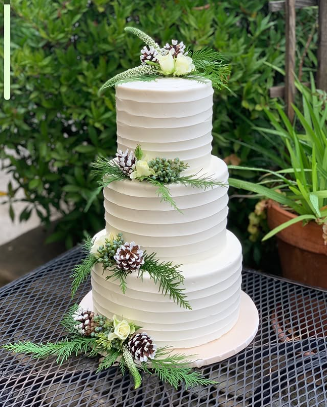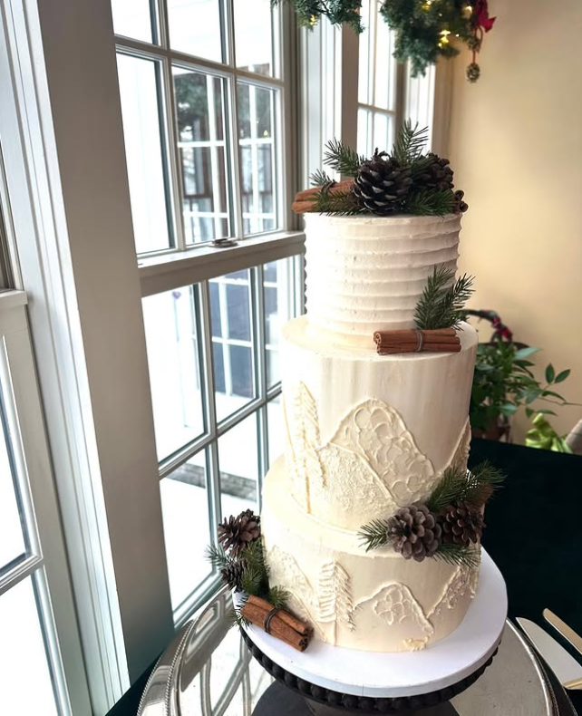 This three-tiered cake beautifully captures the spirit of winter with pinecones, evergreen sprigs, and cinnamon stick accents.