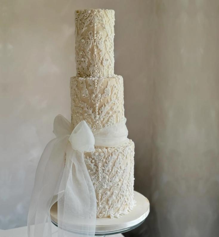 Its timeless white design with ornate artistry makes it a dazzling centerpiece, perfect for couples seeking a sophisticated and regal winter wedding cake.