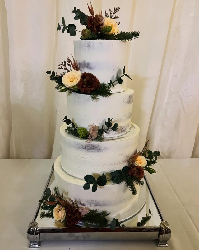 This semi-naked four-tier cake beautifully blends rustic charm with winter elegance.