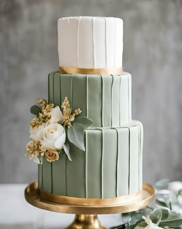 This chic winter wedding cake pairs muted sage green with crisp white for a modern, sophisticated look.