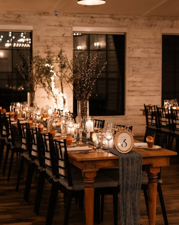 This breathtaking winter wedding reception brings together elegance and warmth with long wooden tables adorned in greenery, gold accents, and endless candlelight.