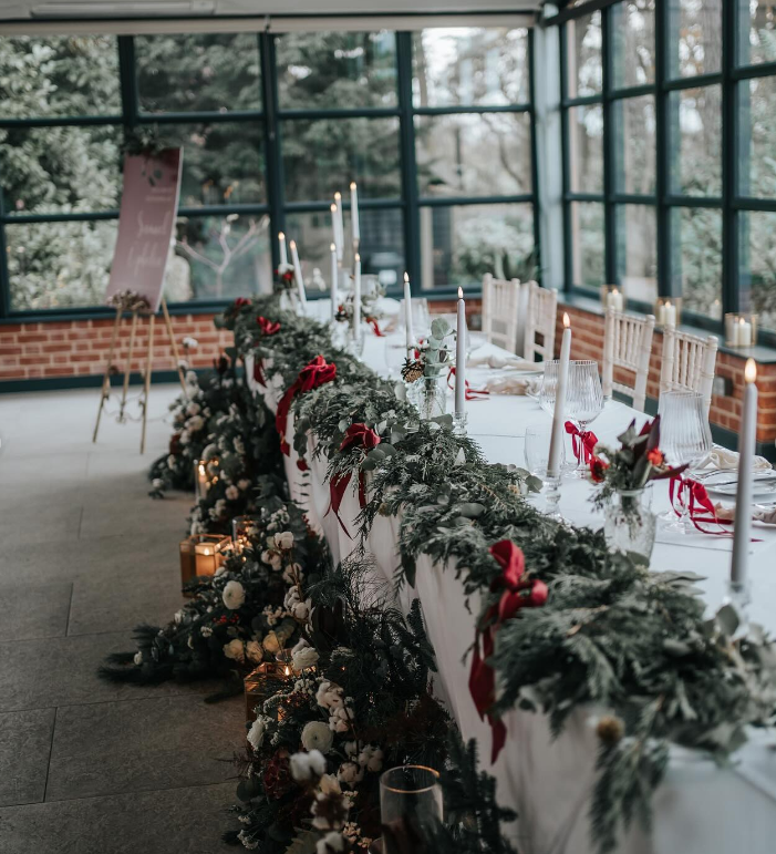 This winter wedding decoration idea features a beautifully styled head table adorned with lush evergreen garlands, accented with deep red ribbons and ivory blooms for a festive yet refined look.
