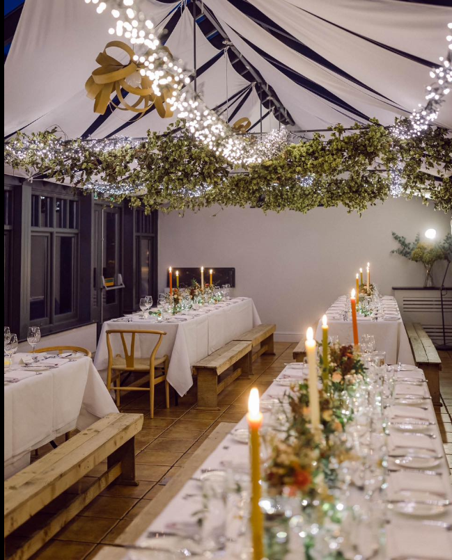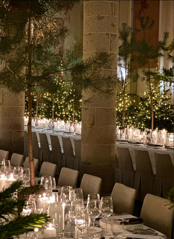 With twinkling fairy lights wrapped around lush evergreens and tall pine trees placed between the tables, the atmosphere feels cozy yet grand.