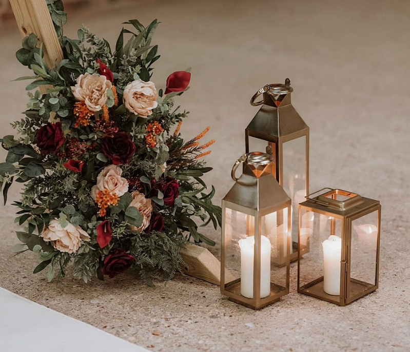 This enchanting winter wedding decoration pairs the warmth of golden lanterns with soft candlelight and rich floral arrangements in deep burgundy, blush, and earthy greens.