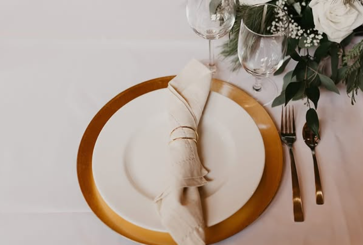 Featuring a gold charger plate, crisp white dinnerware, and a neatly folded napkin secured with a delicate ring, the arrangement exudes understated luxury.