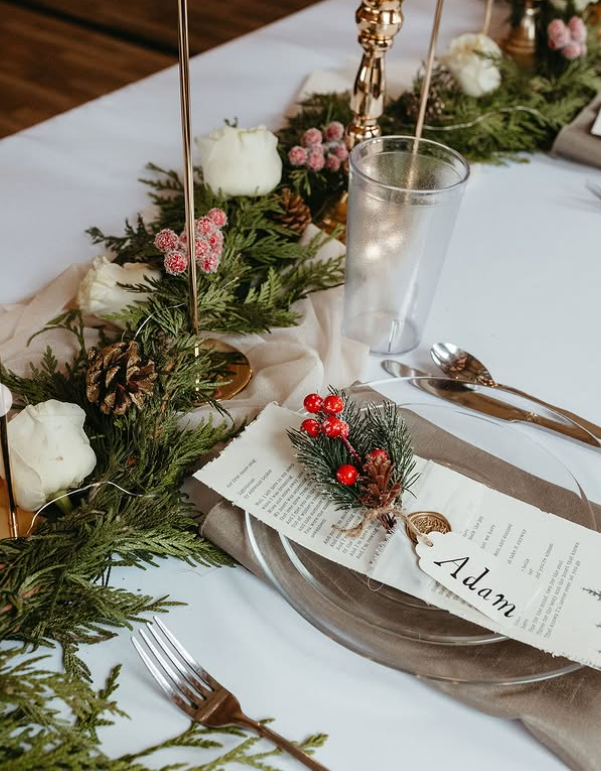 Rustic Winter Wedding Table Setting with Festive Greenery