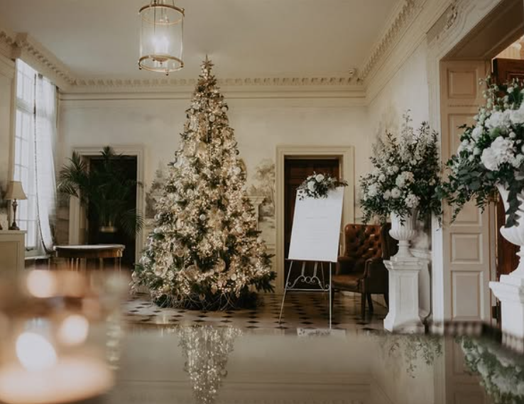 Paired with lush floral arrangements and classic décor, it creates a timeless and festive welcome for guests.