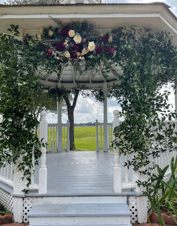 This enchanting gazebo is transformed into a dreamy winter wedding backdrop with lush greenery and cascading florals in deep red and cream tones.