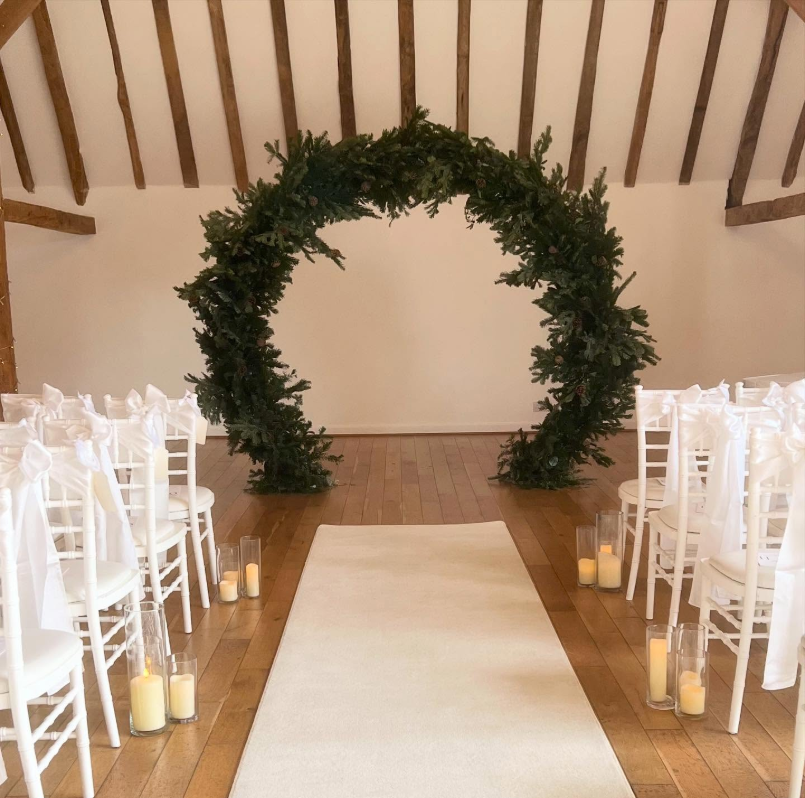 This stunning indoor setup features a lush green circular arch, perfect for a cozy winter wedding ceremony.
