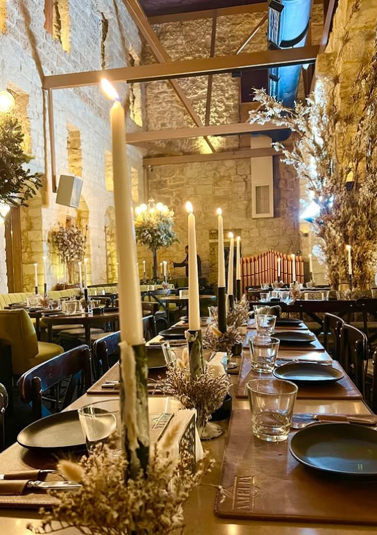 Combined with the exposed stone walls and wooden beams, the décor creates an intimate, old-world winter atmosphere that feels both cozy and sophisticated.