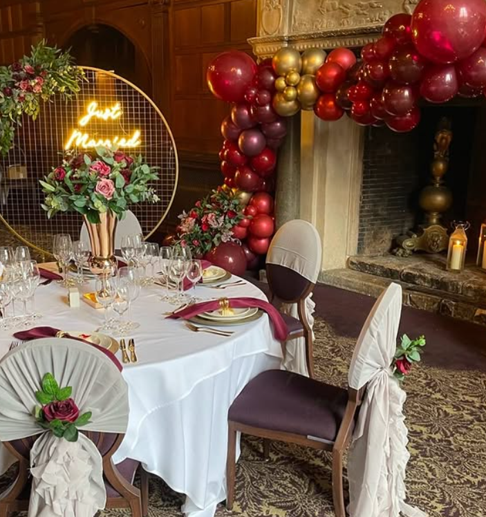 Add a playful yet elegant touch to your winter wedding with a mix of rich burgundy and gold balloons, paired with romantic floral accents.