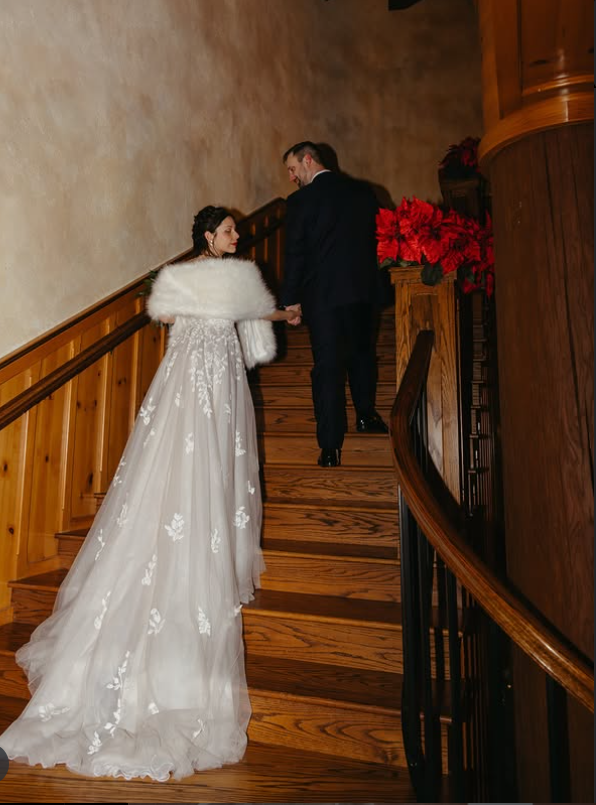 The bride’s gown features delicate floral appliqués cascading down a flowing tulle skirt, paired with a chic white fur stole for added coziness.