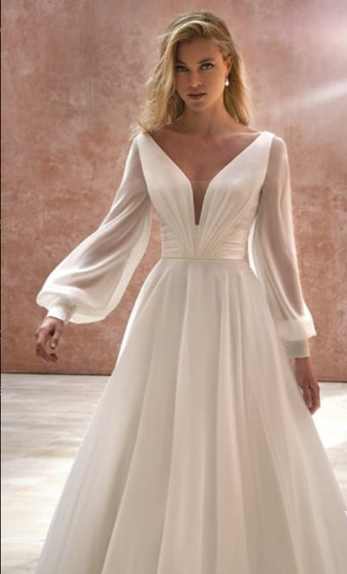This breathtaking winter wedding gown combines a deep V-neckline with flowing sheer bishop sleeves, creating a look that’s both regal and romantic.