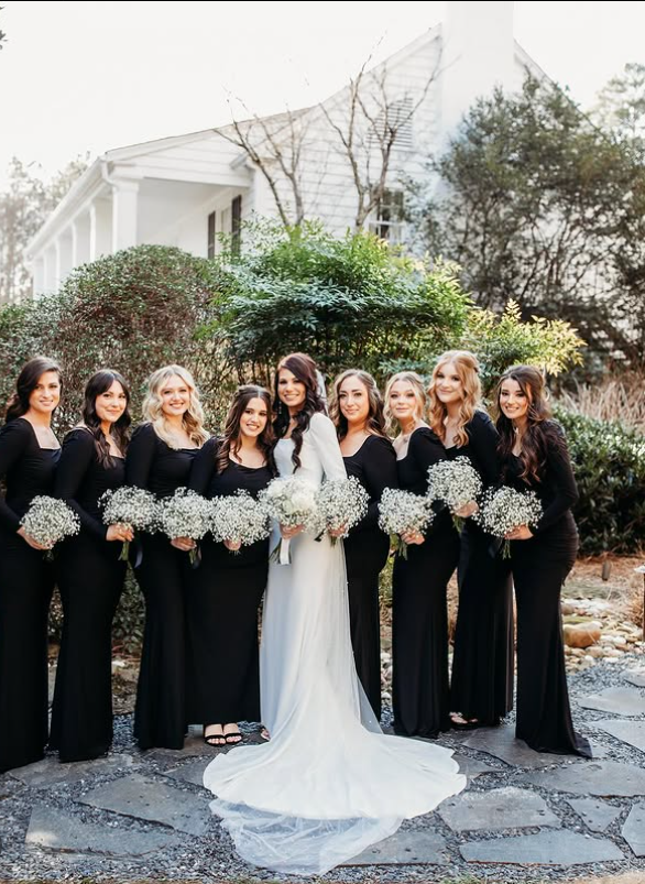 The contrast of black and white creates a striking, sophisticated palette, while the bridesmaids’ bouquets of delicate baby’s breath add a soft, wintry touch.