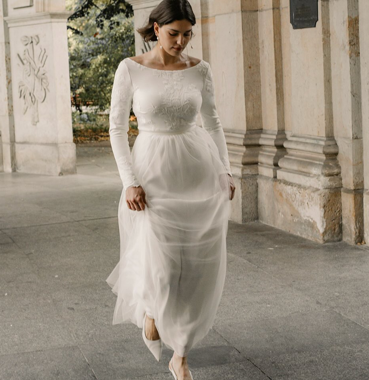 This elegant wedding gown embodies timeless winter charm with its fitted long sleeves, soft embroidery, and flowing tulle skirt.