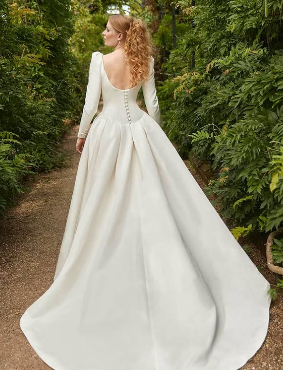 This timeless satin gown with a square neckline and long sleeves exudes pure sophistication, making it a perfect choice for a winter wedding.