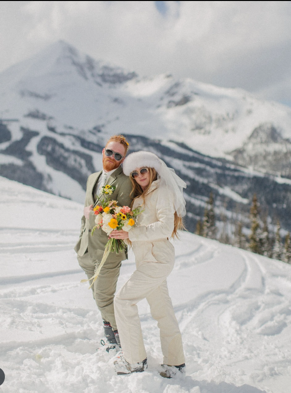 The couple’s chic snow gear, paired with vibrant florals, adds a playful yet stylish twist to the traditional wedding look.