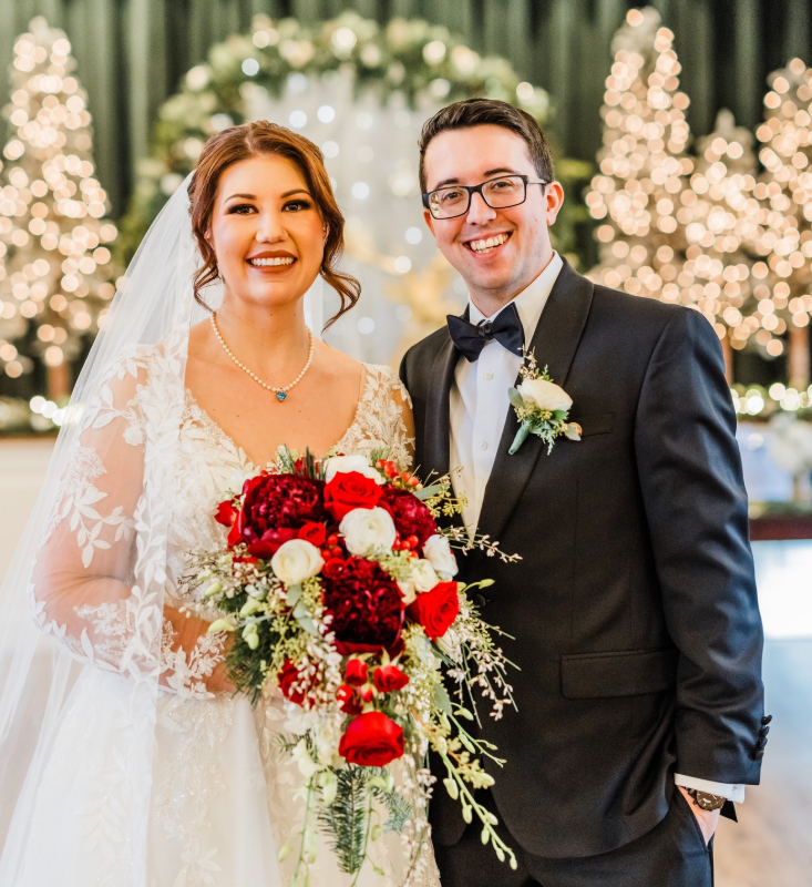 The bride’s lace gown and vibrant bouquet of deep red and white roses add festive warmth, while the groom’s sharp black suit completes the sophisticated look.