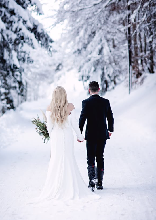 A breathtaking shot of a bride and groom walking hand-in-hand down a snow-covered forest path.